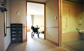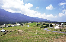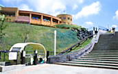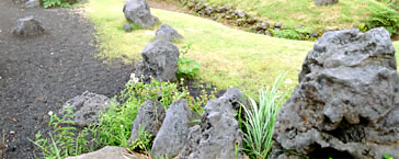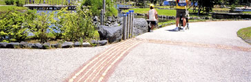 白杖利用者のための誘導ガイドを周辺の施設、環境に合わせた素材(溶岩、丸太等)を選んで設計している。交差点等の注意喚起ブロックは一般的な点字ブロックではなく、自然素材(玉石)による凹凸でデザインした。
