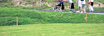 工事がある程度進んだ段階で視覚障害者と車椅子利用者に工事現場に来てもらい、試験施工区間を使って実地体験によるワークショップを行った。目的は、舗装、案内施設、誘導施設等が実際に機能するかどうかを確認するとともに、公園に来てみて感じた |