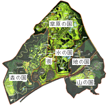 視覚に対しては各「小国」や個別の遊び場等のようすを楽しげに連想させるために各種のピクトをデザインしている。「小国」のテーマとする素材(溶岩、木等)、それぞれの場所の地形、活動イメージなどをデフォルメしてデザインしている。