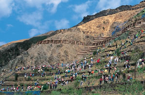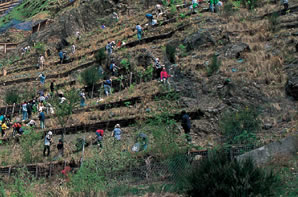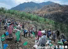 いくつかの市民グループらが 「足尾に緑を。渡良瀬に清流を」 のかけ声のもとに結束し、ボランティアを集い、 禿山に木を植え始めた。 |