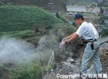 夏の手入れ。 亜硫酸ガスにより酸性化した土壌を 中和させるために石灰を撒く |