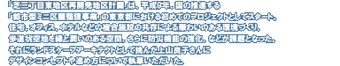 舞台装置は出来上がった。この空間と運営と演出が一体となったとき、この新しく生まれ変わった街は、生き生きと次世紀へ、あらたな「土地の記憶」を刻していくことになろう。ここで働き、生活し遊ぶ主役の演技者たちが悠久の時の流れと「やすらぎ」を感じてもらうことこそ私たち創り手にとって限りない喜びである。 |