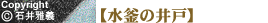 もとあった井戸のメタファーとして、3つの噴水が創られている。「記憶の井戸」といわれる「宙の広場」にある主噴水は、記憶のレイヤーを石の層として表現し、その間に再生のシンボルとしての水を流した装置である。「迷宮の井戸」は水路の水の源として、吹き上げるピラミッド型の水の乱舞が迷宮の水路を流れ、時の流れの不思議な様を表す。「水釜の井戸」では、悠久の時の流れを、鏡面上にうすく張った水盤の水が石壁をつたって流れる水に託している。これら噴水からの水は水路を流れて循環されている。3つの百年以上忘れられていた「井戸」はみごとに再生された。