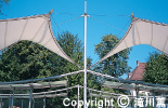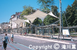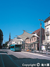 | 南ドイツの小都市オッフェンブルクの駅を降りると、船の帆のようなダイナミックな曲線に波打つバスターミナルの屋根に目を奪われる。2000年に竣工したこの停留所のデザインは、膜構造で有名な設計事務所IPLによるもので、大屋根なのに軽さや透明感があり、歴史ある町の玄関口を視覚的に印象づけるのにふさわしいという理由から選ばれた。日よけとなる真っ白な帆はPTFE(ポリテトラフルオエチレン)ガラス繊維製で、グレーに塗られた鉄のマストと特殊鋼のワイヤーで7つの点から引っ張られている。その下の